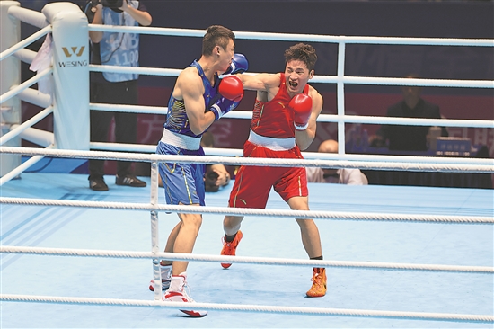 11月11日,四川隊選手王小保(右)與山東體育學院隊選手王金祥在比賽中。本報記者 王羨茹 攝