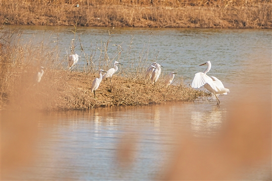 11月13日,在黃河三角洲國家級(jí)自然保護(hù)區(qū),白鷺在濕地休憩。