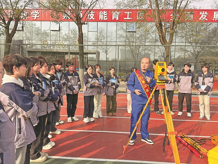 聘任儀式結束后,中鐵七局集團西鐵工程公司精測隊副隊長、三秦工匠李國強作為受聘教師,拿著全站儀等測量工具來到學校操場,學生們圍在他周圍認真聽他授課。