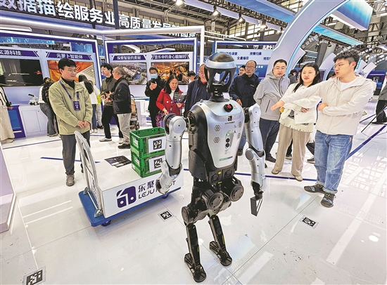 圖為10月19日,張鴻偉(右一)在2025中國國際數字經濟博覽會上為觀眾介紹“夸父”機器人。