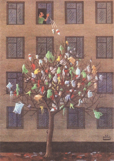 生活中,樓上拋物是人們嗤之以鼻的惡行。這里的居民從窗戶(hù)丟棄的塑料和紙質(zhì)口袋,制造了奇特的“樹(shù)”,真令人討嫌!