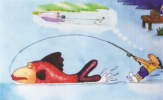 豐富多彩的水上運(yùn)動(dòng),變化多端。恰巧垂釣者釣住大魚(yú),由于無(wú)法收桿竟因勢(shì)利導(dǎo),將“靜態(tài)”養(yǎng)生變成動(dòng)態(tài)沖浪。