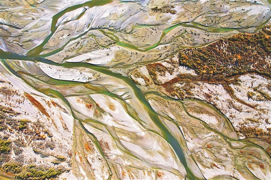 11月9日,新疆阿克蘇地區(qū)。初冬時(shí)節(jié),庫瑪力克河溫宿縣吐木秀克鎮(zhèn)河段,河床如大地的脈絡(luò)肌理,河水在沙洲間蜿蜒分汊,沿岸植被色彩斑斕,生機(jī)別樣。