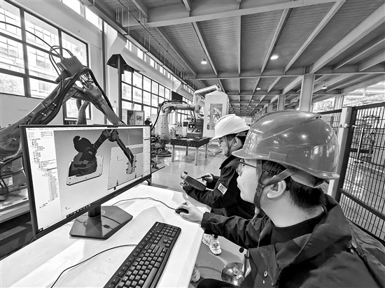 11月13日,在湖南中南智能裝備有限公司研發(fā)車間的機(jī)器人焊接工藝知識圖譜研發(fā)區(qū),軟件工程師王子軍(右)和調(diào)試工程師晏鑫正在優(yōu)化離線編程軟件,以便更好地操控焊接機(jī)器人。