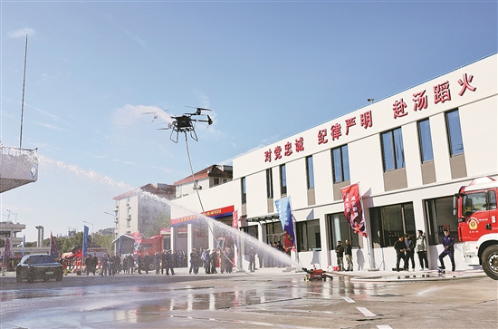 11月18日,消防無人機和高壓水炮機器狗在活動現(xiàn)場進行作業(yè)演示。