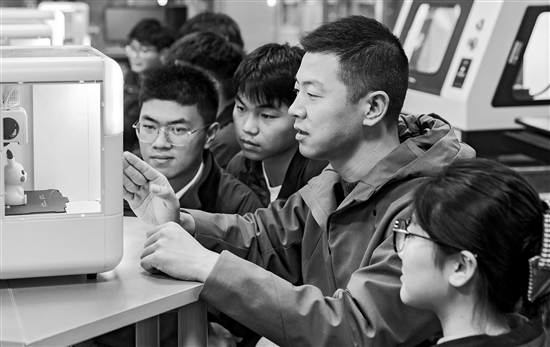 11月17日,江蘇省海安中等專業(yè)學(xué)校的學(xué)生們在老師的指導(dǎo)下進行3D打印實訓(xùn)。該校深入推進產(chǎn)教融合和科教融匯,針對性地開設(shè)3D打印、工業(yè)機器人應(yīng)用、數(shù)控技術(shù)等特色課程,不斷提升學(xué)生的綜合職業(yè)技能水平和實操能力,促進人才供需高效匹配和職業(yè)教育高質(zhì)量發(fā)展。翟偉凱 攝/視覺中國