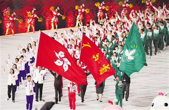 11月9日,廣東省體育代表團、香港特別行政區(qū)體育代表團和澳門特別行政區(qū)體育代表團在第十五屆全國運動會開幕式上共同入場。新華社記者 賴向東 攝